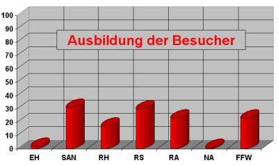 | Fast alle Besucher von Rettungsdienst.NET haben auch eine Rettungsdienstausbildung, viele kommen auch aus dem Bereich der Feuerwehr oder Intensivpflege oder haben LRA und Organisatorischer Leiter RD als Zusatzqualifikation angegeben. Die Gesamtsumme ist größer als 100%, da z.B. viele der Feuerwehrmitglieder auch RA oder RS sind. |
