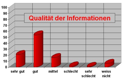 75% der Besucher geben Rettungsdienst.NET die Note "gut" (Note = 2) oder sogar "sehr gut" (Note = 1) für die Qualität der zur Verfügung gestellten Informationen. Nur insgesamt 4 von 150 Personen waren mit der Qualität der Informationen nicht zufrieden und bewerteten diese als schlecht (Note = 4) oder einmal auch als sehr schlecht (Note = 5). |