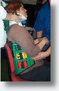 | Zunächst wird das KED mit der weichen Seite zum Patienten vorsichtig zwischen Sitz und Patient geschoben. Dies ist am einfachsten, wenn man das System schräg von oben in den Spalt zwischen Patient und Sitz schiebt und erst dann achsengerecht ausrichtet. Das KED sollte nun unten auf der Sitzfläche anstoßen. Nun können die Beckengurte gelöst werden (Kennzeichen: weiße Schnalle), damit sie beim weiteren Vorgehen nicht im Weg sind. Als Nächstes können die Bruststützklappen des KED um den Thorax des Patienten gelegt werden. Dabei ist darauf zu achten, dass das KED nun so weit nach oben geschoben wird, dass die Stützklappen genau unter den Achselhöhlen zu liegen kommen. Da durch wird verhindert, daß der Patient später beim Herausheben mit dem KED in diesem nach unten verrutschen kann. |