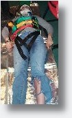 | Als nächstes werden die beiden Hüftgurte angebracht. Dazu wird der Gurt jeweils unter dem Gesäß und Bein des Patienten hinduchgezogen und dann über den entfernten Oberschenkel zur gegenüberliegenden weißen Schnalle geführt. Jeder Gurt läuft also unter dem ersten Oberschenkel und über dem zweiten Oberschenkel in "Verlegerichtung" gesehen entlang. Nachdem mit beiden Gurten so verfahren wurde, sollten diese sich im Schritt überkreuzen. Bei Verdacht auf Verletzungen in der Leistengegend können die Gurte auch um das jeweilig erste Bein geschlungen werden und dann auf der Ausgangsseite des Gurtes in das Gurtschloss eingeklingt werden. Bei Oberschenkelfrakturen sollte gegebenenfalls auf die Beckengurte ganz verzichtet werden. |