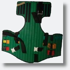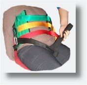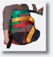 | Das KED-System ist in horizontaler Richtung flexibel, während es in der vertikalen Richtung starr ist. Auf diese Weise kann es von hinten flexibel um den Patienten herumgelegt werden und fixiert trotzdem die Wirbelsäule in der vertikalen Richtung starr. Vor dem Einsatz des KED sollten die drei farbigen Brustgurte zusammengefaltet und am KED fixiert werden. Ebenso sind die beiden Beckengurte (schwarz) hinter dem KED durchzuziehen und an der Oberseite anzukletten. Nur so kann das KED ohne Probleme z.B. zwischen PKW-Sitz und Patient geschoben werden. Im Bild ist der rechte Beckengurt noch auf diese Weise am Kopfteil des KED befestigt, während der linke Gurt gelöst wurde. |