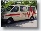 KTW: Notfallkoffer - Verbandsmaterial, Ambu-Beutel + O2-Flasche, O2 Masken+Brillen, Blutzuckermessstreifen u. Stecher, Scheren u. Pinzetten, Stetoskop + RR-Manschette, usw. Trage, Tragsessel, Absauger, Automat. Defi, SamSplint-Schienen, Arztkoffer, Rettungstuch, 2 KTW haben Schwebetragen. RTW: Selbiges + BZ-Messgerät, Waschbecken, grosser Arztkoffer, Kinderkoffer, Vak.-Arm- und Beinschienen, 2. Ambu, StifNeck, Rettungsteddys, Schaufeltrage, Schwebetrage und eine Menge mehr von jedem Teil als am KTW. Die Kommunikation erfolgt meist über Datenfunk, jedoch auch über Fahrzeugfunk und Handfunkgeräte, 3 Leute besetzen tagsüber die Funkleitstelle.Der RTW ist das Rettungsmittel N°1, ausser ein KTW ist wesentlich näher am Einsatzort, oder es ist kein RTW verfügbar, bzw. der Auftrag ist nicht RTW-indiziert. Für den NAW gibt es eine Indikationsliste. Der NAW steht im Unfallkrankenhaus und die anderen Fahrzeuge stehen in 2 Dienststellen, es werden aber bald 3. |